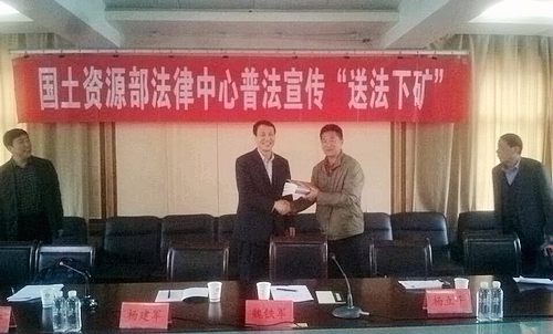 國土資源部法律中心副主任魏鐵軍向韓城礦業(yè)董事長王世斌贈送普法書籍