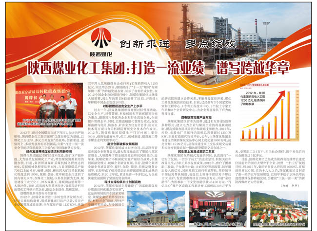 2012年,面對(duì)全國(guó)煤炭市場(chǎng)下行壓力加大的嚴(yán)峻形勢(shì),陜西煤業(yè)化工集團(tuán)按照“以煤炭開發(fā)為基礎(chǔ),以煤化工為主導(dǎo),多元互補(bǔ)發(fā)展”的戰(zhàn)略,創(chuàng)新求進(jìn),逆勢(shì)而上,多項(xiàng)發(fā)展指標(biāo)再創(chuàng)新高,向著“打造中國(guó)一流安全節(jié)能環(huán)保能源化工企業(yè)”的目標(biāo)邁出堅(jiān)實(shí)步伐。