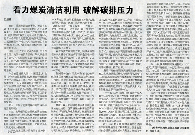 近日,新華社《陜西領導參考》、中國能源報、中國煤炭報、中國化工報等重要媒體刊發(fā)了陜西煤業(yè)化工集團公司董事長、黨委書記華煒的署名文章《借煤炭清潔利用破解排碳壓力》。