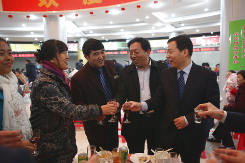 除夕員工家屬答謝宴會上公司領(lǐng)導與員工家屬碰杯互賀新春