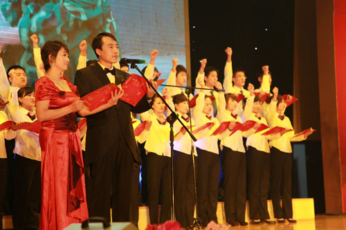 為此次慶祝晚會(huì),公司精心挑選了精彩的節(jié)目,歌伴舞《今天是你的生日》、《陜焦之歌》、小品《防火于未燃》等節(jié)目,演員們意氣風(fēng)發(fā)技藝精湛的表演引來(lái)觀(guān)眾經(jīng)久不息的掌聲,在知名主持人那混厚優(yōu)美的主持詞里我們仿佛穿透了40年的漫長(zhǎng)時(shí)空,眼望著鮮紅的陜焦公司四十周年的字符,一個(gè)全新的陜焦伊然在現(xiàn)場(chǎng)的觀(guān)眾心中升起?!澳壑拍?,凝聚著理想,凝聚著青春年華,陜焦夢(mèng)想,奔騰著熱血,奔騰著海洋,奔騰著波瀾洶涌浩瀚的胸膛”,一首由公司基層員工及中層領(lǐng)導(dǎo)干部40余人排練的配樂(lè)詩(shī)朗誦“陜焦夢(mèng)想”,凝聚了陜焦老中青三代人的心聲,深情的回顧了陜焦四十年的風(fēng)雨歷程,謳歌了歷屆為公司做出杰出貢獻(xiàn)的建設(shè)者,歌頌陜焦發(fā)展的不同時(shí)期,凝練著陜焦人對(duì)企業(yè)深厚的情感,表演者飽滿(mǎn)的激情和真情的流露打動(dòng)了在場(chǎng)的每一位觀(guān)眾,動(dòng)情之處,許多老干部們,悄悄地拭去了激動(dòng)的淚花,現(xiàn)場(chǎng)不時(shí)爆發(fā)出雷鳴般的掌聲,將晚會(huì)掀向高潮。