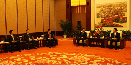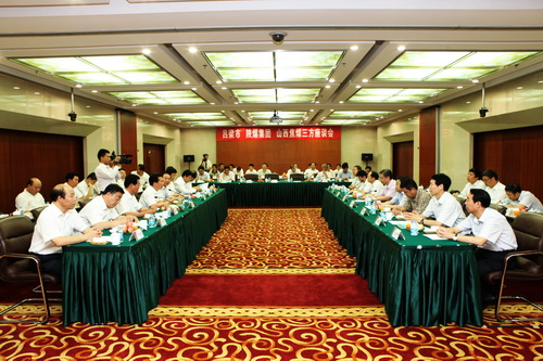 山西省委常委、常務(wù)副省長(zhǎng)李小鵬(右一)會(huì)見陜西省副省長(zhǎng)吳登昌(右二)和陜煤化集團(tuán)公司領(lǐng)導(dǎo)