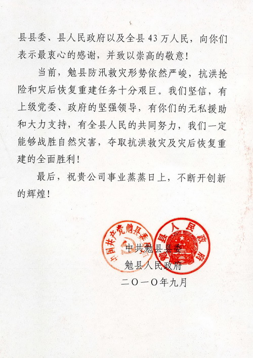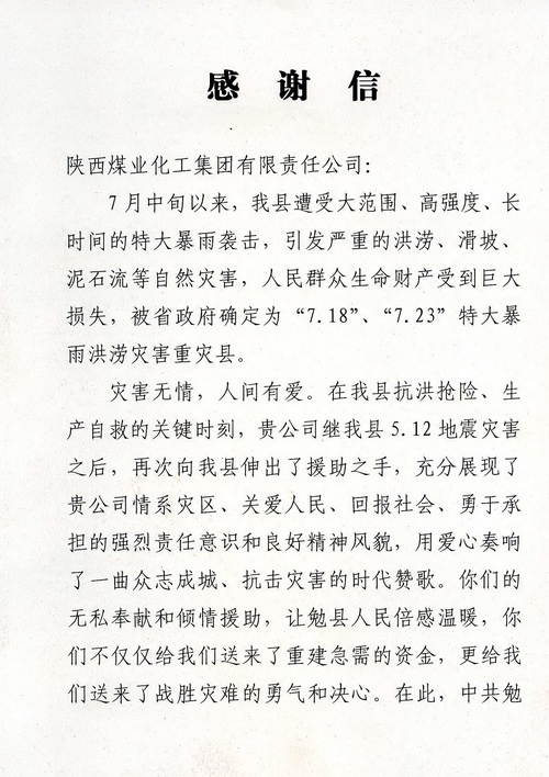 座談中,勉縣縣長李芳代表縣委、縣政府及全縣43萬人民,對陜煤化集團在今年“7.18”、“7.23”特大暴雨洪災中,向勉縣伸出無私援助和災后恢復重建工作的大力支持表示衷心感謝。并送來感謝信和寫有“心系災區(qū)獻大愛,無私援助暖人心”牌匾,表達了災區(qū)人民的感恩之情。她說,援助災區(qū)充分體現(xiàn)了陜煤化集團情系災區(qū)、關(guān)愛人民、回報社會、勇于承擔的社會責任意識和良好的精神風貌,有陜煤化集團的大力支持,全縣人民一定能奪取抗洪救災和災后恢復重建的全面勝利。在聽取了勉縣領(lǐng)導對暴雨洪災恢復重建工作的開展情況匯報后,總經(jīng)理高仰才講到,恢復重建的工作方案措施得力,進展很快,相信勉縣領(lǐng)導班子能夠克服一切困難做好重建工作。他說,陜煤化集團在快速發(fā)展的同時,也盡最大的能力承擔著一個國有企業(yè)應(yīng)盡的社會責任義務(wù)。近幾年來,累計為社會捐款1.1億元,并在抗擊冰凍災害、支援地震災區(qū)建設(shè)、社會扶貧等方面發(fā)揮國有企業(yè)應(yīng)有的作用。