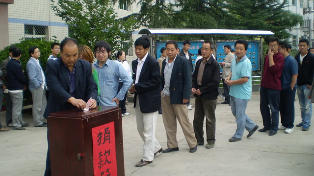 繼今年4月份向玉樹捐款后,西安重工裝備制造集團有限公司再掀捐款高潮。重裝集團在接到陜煤化集團的文件后,立即行動起來,積極動員干部職工向我省特大暴雨洪澇災害受災群眾開展捐贈活動。8月23日下午,僅僅用了15分鐘,重裝集團機關全體干部職工在黨委書記王增強的帶領下,共捐款9100元,人均捐款超過200元。截止8月26日,重裝集團參加捐款的人數共計2773人,共捐款104552.1元。