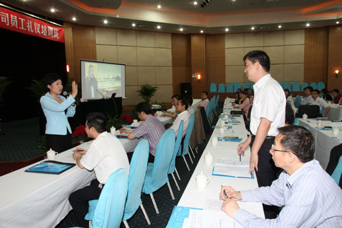 為進一步提高廣大員工的禮貌禮儀、行為規(guī)范和服務意識,提升公司形象和競爭實力。5月27日,陜煤股份公司在雍村飯店舉辦了員工禮儀培訓班,特邀西安華夏禮儀網(wǎng)高級禮儀培訓師楊揚主講。股份公司全體員工及集團公司部分員工共計50余人參加了培訓。