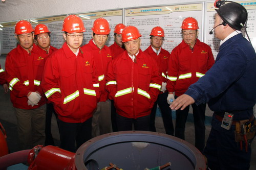 在黃陵礦業(yè)集團公司總經(jīng)理宋老虎(左三)、黨委書記閆勃(右三)等陪同下,中煤政研會會長田淮?。ㄗ笏模㈩檰栺R德慶(右四)、副秘書長李演珍(右二)、徐騰生處長(左一)在一號煤礦井下實訓(xùn)基地觀看雙述表演、專業(yè)功力和作業(yè)功夫演練。