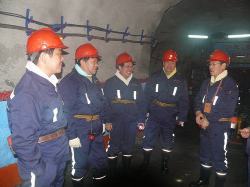集團(tuán)公司副總經(jīng)理朱周岐(左二)在朱家河礦井下檢查安全質(zhì)量標(biāo)準(zhǔn)化工作。