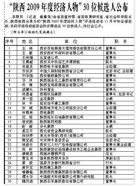 由省委宣傳部、省委政策研究室、省社會科學院主辦,陜西電視臺承辦的“陜西2009年度經(jīng)濟人物”評選活動活動自11月中旬全面啟動,目前評選活動組委會初步篩選出30位候選人,向社會公示。這也是首次評選陜西年度經(jīng)濟人物。陜西煤業(yè)化工集團公司董事長、黨委書記華煒入選該候選人名單。