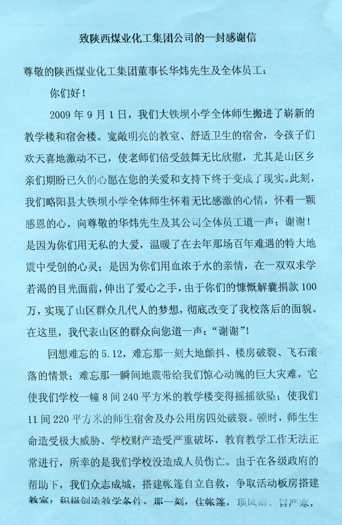 “2009年9月1日,我們大鐵壩小學(xué)全體師生搬進(jìn)了嶄新的教學(xué)樓和宿舍樓……全體師生懷著無(wú)比感激的心情,懷著一顆感恩的心,向尊敬的華煒先生及其公司全體員工道一聲:謝謝!……”日前,一封來(lái)自地震災(zāi)區(qū)陜西省略陽(yáng)縣硤口驛鎮(zhèn)大鐵壩小學(xué)的感謝信寄到了陜西煤業(yè)化工集團(tuán)公司,對(duì)該集團(tuán)公司捐款幫助該校重建教學(xué)樓和宿舍樓表示衷心的感謝。