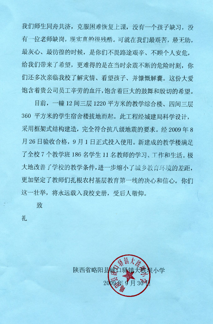 感謝信中寫(xiě)到,去年5?12四川汶川特大地震中,大鐵壩小學(xué)一幢8間240平方米的教學(xué)樓變得搖搖欲墜,11間220平方米的師生宿舍及辦公用房四處破裂。災(zāi)后,學(xué)校搭建帳篷自立自救,爭(zhēng)取活動(dòng)板房搭建教室,開(kāi)始頂風(fēng)雨、冒嚴(yán)寒,師生同舟共濟(jì),克服困難恢復(fù)上課。就在這時(shí),陜西煤業(yè)化工集團(tuán)公司黨委書(shū)記、董事長(zhǎng)華煒一行在余震不斷的情況下,不畏路途艱辛、不顧個(gè)人安危,親臨學(xué)校了解災(zāi)情、看望孩子、并慷慨解囊,援助該校重建。目前,一幢12間三層1220平方米的教學(xué)綜合樓、四間三層360平方米的學(xué)生宿舍樓拔地而起。此工程經(jīng)城建局科學(xué)設(shè)計(jì),采用框架式結(jié)構(gòu)建造,完全符合抗八級(jí)地震的要求。經(jīng)2009年8月26日驗(yàn)收合格,9月1日正式投入使用。新建成的教學(xué)樓滿(mǎn)足了全校7個(gè)教學(xué)班186名學(xué)生11名教師的學(xué)習(xí)、工作和生活。極大地改善了學(xué)校的教學(xué)條件,進(jìn)一步縮小了城鄉(xiāng)教育環(huán)境的差距,更加堅(jiān)定了教師們?cè)r(nóng)村基層教育第一線(xiàn)的決心和信心。感謝信最后,飽含感恩之心寫(xiě)到:“你們這一壯舉,將永遠(yuǎn)載入我校史冊(cè),受后人敬仰?!?/p>