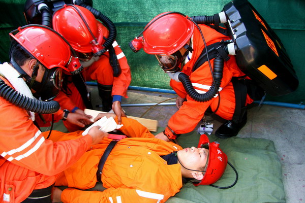 16日上午,救援技術(shù)比武正是開始,首先進(jìn)行的是綜合體能測試。四五米高的爬繩、15個(gè)單杠引體向上、快速著裝、爬矮巷、背上急救器械進(jìn)行1000米跑、驗(yàn)力測試等一整套動(dòng)作,要求一氣呵成,既要保證在規(guī)定時(shí)間內(nèi)完成,又要爭分奪秒,力爭得到加分,其強(qiáng)度完全是對身體極限的挑戰(zhàn)。但選手們沒有一個(gè)是弱者,只見他們雙手緊握大繩,毫不費(fèi)勁嗖嗖幾下就爬了上去,然后“哧溜”下來,又快步跑向單杠,飛快下杠,背上急救器械馬上開始跑步,一圈、兩圈……引得觀摩的隊(duì)員不斷喝彩。 “氧氣瓶固定螺絲出現(xiàn)松動(dòng)!”“清凈罐與氣囊連接松動(dòng)!”16日下午,參加呼吸器操作競賽的選手們正在進(jìn)行激烈角逐?!按蠹也灰?,細(xì)致檢查設(shè)備每個(gè)環(huán)節(jié),對安全隱患進(jìn)行逐項(xiàng)排除!”參賽隊(duì)長不停地叮囑隊(duì)員……17日上午,在模擬救災(zāi)現(xiàn)場,“你們的任務(wù)是對事故進(jìn)行搶險(xiǎn)處理,大家開始檢查救援設(shè)備,準(zhǔn)備進(jìn)入現(xiàn)場!”選手們在迅速對救護(hù)器、擔(dān)架等救援設(shè)備進(jìn)行安檢后,進(jìn)入了模擬巷道?!按蠹易⒁?,巷道前方二氧化碳濃度較高,請記錄二氧化碳濃度!打開救援設(shè)備……”模擬巷道里傳出了選手們的交流聲……“險(xiǎn)情已被排除,被困人員順利救出?!苯?jīng)過大家合力攻堅(jiān),出色地完成了比賽。18日上午進(jìn)行的是醫(yī)療急救競賽項(xiàng)目,主要是衡量一名礦山應(yīng)急救援隊(duì)員的現(xiàn)場醫(yī)療急救技術(shù)發(fā)揮。其通過模擬傷員的傷情診斷、簡單包扎、搬運(yùn)處理等,來考核隊(duì)員的應(yīng)急救援技能水平。