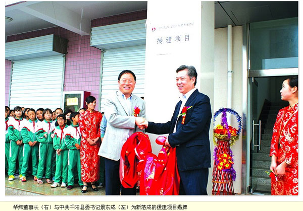 8月28日,秋雨綿綿。陜西煤業(yè)化工集團(tuán)公司董事長(zhǎng)、黨委書(shū)記華煒一大早冒雨從西安趕赴千陽(yáng),現(xiàn)場(chǎng)視察集團(tuán)援建千陽(yáng)縣的災(zāi)后重建項(xiàng)目,并為該縣青少年校外活動(dòng)中心和張家塬中學(xué)學(xué)生公寓樓項(xiàng)目落成揭牌。當(dāng)看到集團(tuán)援建的一個(gè)個(gè)項(xiàng)目相繼落成,華煒心情十分高興,他當(dāng)場(chǎng)表示再次撥付千陽(yáng)縣援建資金1000萬(wàn)元,至此集團(tuán)已累計(jì)為援建千陽(yáng)縣的22個(gè)災(zāi)后重建項(xiàng)目無(wú)償提供援建資金4500萬(wàn)元,其中15個(gè)項(xiàng)目已全面建成投用。