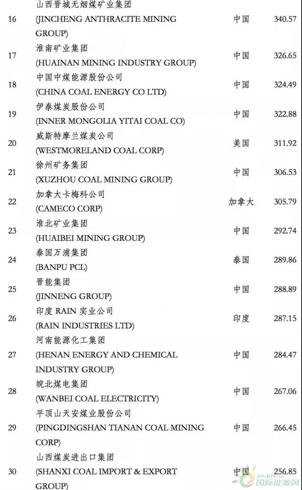 煤炭企業(yè)全球競爭力排行榜 30 強
