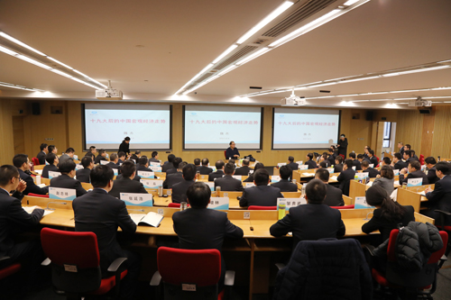 “研判黨的十九大后中國(guó)宏觀經(jīng)濟(jì)走勢(shì),必須要搞清楚兩個(gè)問(wèn)題,一是中國(guó)經(jīng)濟(jì)未來(lái)發(fā)展的增長(zhǎng)點(diǎn)在哪里?我們未來(lái)發(fā)展需要防范的風(fēng)險(xiǎn)是什么?”魏杰教授在報(bào)告一開(kāi)始,便提出兩個(gè)問(wèn)題,他以十九大報(bào)告中提及的有關(guān)經(jīng)濟(jì)內(nèi)容,結(jié)合國(guó)家現(xiàn)階段發(fā)展情況,著重分析了未來(lái)對(duì)我國(guó)經(jīng)濟(jì)發(fā)展將起到支柱性作用的新興產(chǎn)業(yè),并對(duì)在全方位開(kāi)放的布局中如何防范來(lái)自金融領(lǐng)域的風(fēng)險(xiǎn)給出了條理清晰、學(xué)術(shù)嚴(yán)謹(jǐn)?shù)恼摂?。以大量的調(diào)研為基礎(chǔ),旁征博引、以小見(jiàn)大,深入淺出的對(duì)中國(guó)宏觀經(jīng)濟(jì)發(fā)展做出了條分縷析的研判。