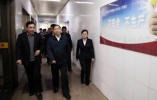 10月23日,陜西省委常委、省委統(tǒng)戰(zhàn)部部長、副省長姜鋒,深入蒲白西固煤業(yè)對安全生產(chǎn)工作情況進行檢查調(diào)研。省政府副秘書長張宗科,省安監(jiān)局局長王昊文、省交警總隊政委李昌,省交通廳副廳長丁勝仁,省煤管局局長陳永昌,渭南市、白水縣政府及有關(guān)部門領(lǐng)導(dǎo)隨行。蒲白礦業(yè)公司黨委書記、董事長沈顯華,總經(jīng)理張維新等陪同檢查。