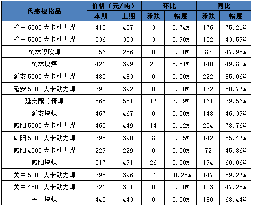 表2:陜西煤炭代表規(guī)格品價(jià)格