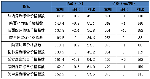其中分品種:動力煤指數(shù)140.4點,較上期下跌0.2點;配焦精煤指數(shù)132.8點,較上期下跌2.4點;噴吹煤指數(shù)106.5點,較上期持平;塊煤指數(shù)118.1點,較上期下跌0.2點。分區(qū)域:榆林指數(shù)133.9點,較上期持平;延安指數(shù)151.4點,較上期下跌1.7點;咸陽指數(shù)162.2點,較上期下跌0.3點;關(guān)中指數(shù)152.9點,較上期持平。