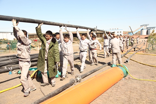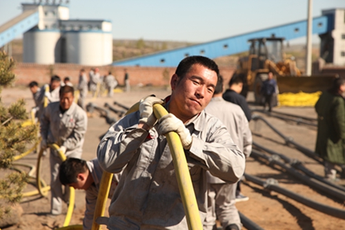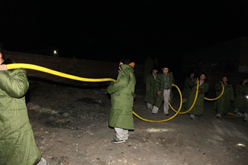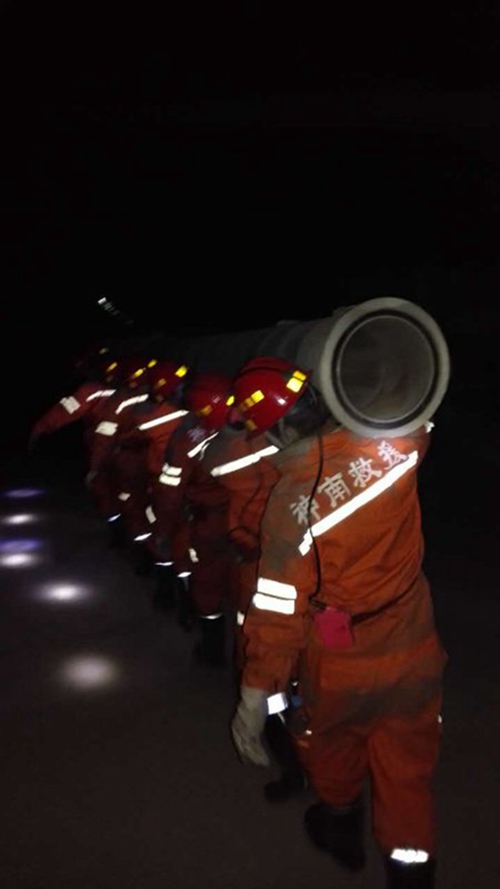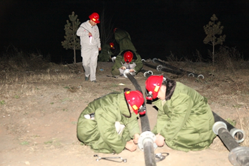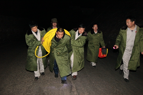 21時,神南救護隊接到指揮部命令,進行排水管路鋪設工作,先后到達的兩支救援隊迅速合并投入戰(zhàn)斗。當天,大風降溫,出事礦井地處丘陵突出部,陣風風力達到6級,現(xiàn)場氣溫低至5℃。救援現(xiàn)場,救護指戰(zhàn)員們深知時間就是生命,要克服一切困難,用最快的速度完成任務。寒風夾雜著煤塵砂礫打的臉上生疼,隊員們毫不躲避,他們用手搬,用肩抗,將一根根直徑30cm,重二百余公斤的排水管搬到指定地點開始架設,現(xiàn)場條件惡劣,環(huán)境艱苦,隊員們日常的戰(zhàn)備訓練起到了作用。