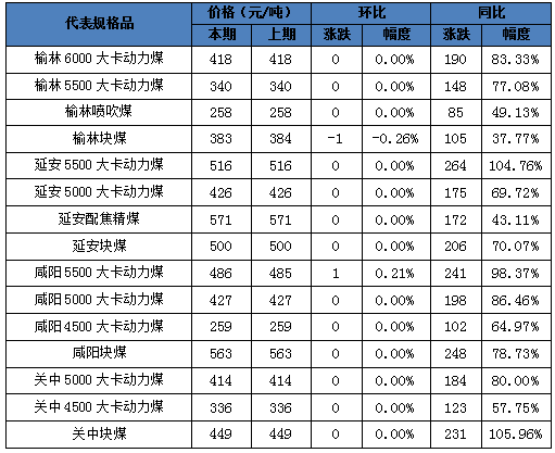 表2:陜西煤炭代表規(guī)格品價格
