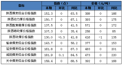 其中分品種:動力煤指數(shù)150.7點,較上期持平;配焦精煤指數(shù)137.5點,較上期持平;噴吹煤指數(shù)107.3點,較上期持平;塊煤指數(shù)130.0點,較上期下跌0.3點;分區(qū)域:榆林指數(shù)143.7點,較上期持平;延安指數(shù)161.8點,較上期持平;咸陽指數(shù)181.9點,較上期上漲0.1點;關中指數(shù)159.4點,較上期持平。