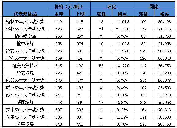 咸陽地區(qū),本期動力煤交易量和上期基本持平,塊煤價格漲幅較大。從監(jiān)測價格情況看:Q5500動力煤均價470元/噸,較上期持平;Q5000動力煤均價426元/噸,較上期持平;Q4500動力煤均價241元/噸,較上期持平;塊煤均價548元/噸,較上期上漲12元/噸。