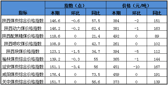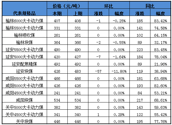 表2:陜西煤炭代表規(guī)格品價(jià)格
