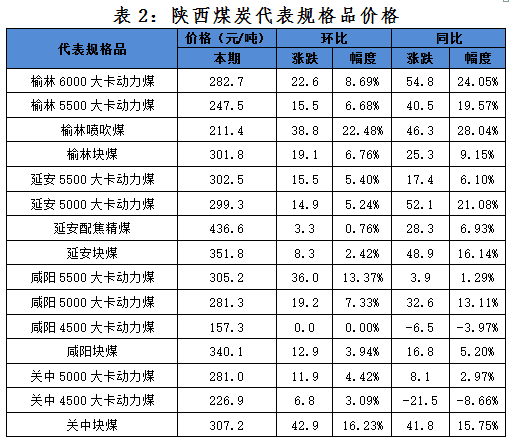 陜西綜合價(jià)格指數(shù)大幅上漲。從品種指數(shù)來(lái)看,動(dòng)力煤指數(shù)、塊煤指數(shù)、配焦精煤指數(shù)和噴吹煤指數(shù)均有不同幅度上漲,其中噴吹煤指數(shù)在經(jīng)歷長(zhǎng)期穩(wěn)定后漲幅較大;從區(qū)域指數(shù)來(lái)看,陜西省內(nèi)四個(gè)主要產(chǎn)煤區(qū)價(jià)格指數(shù)均有上漲,漲幅均超過(guò)4個(gè)點(diǎn);從代表規(guī)格品數(shù)據(jù)來(lái)看,本期陜西煤炭?jī)r(jià)格指數(shù)監(jiān)測(cè)15個(gè)代表規(guī)格品中14個(gè)上漲,1個(gè)持平,漲幅最大為22.5%。