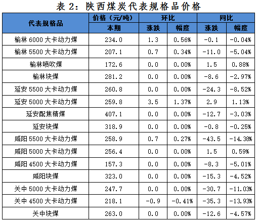 本期陜西綜合價格指數(shù)連續(xù)十一期上漲,從品種指數(shù)來看,動力煤指數(shù)繼續(xù)上漲,漲幅略有擴(kuò)大,塊煤指數(shù)、噴吹煤指數(shù)和配焦精煤指數(shù)保持穩(wěn)定;從區(qū)域指數(shù)來看,榆林指數(shù)、延安指數(shù)和咸陽指數(shù)有不同幅度上漲,關(guān)中指數(shù)有小幅下滑;從代表規(guī)格品數(shù)據(jù)來看,本期三分之一代表規(guī)格品價格保持穩(wěn)定,價格變化代表規(guī)格品以價格均上漲為主,個別代表規(guī)格品價格下跌。
