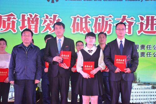 集團公司總經(jīng)理助理、工會負責人李向東,陜西化工集團總經(jīng)理梁玉昆為二等獎獲獎選手頒獎并合影