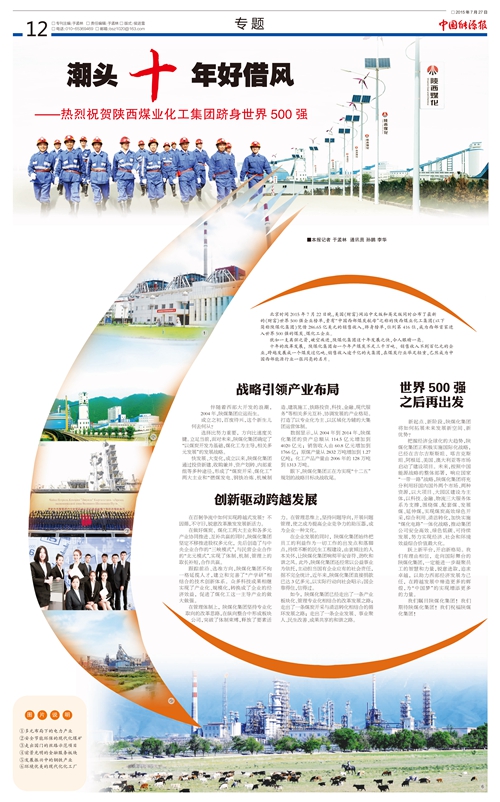 北京時(shí)間2015年7月22日晚,美國(guó)《財(cái)富》網(wǎng)站中文版和英文版同時(shí)公布了最新的《財(cái)富》世界500強(qiáng)企業(yè)榜單,素有“中國(guó)西部煤炭航母”之稱(chēng)的陜西煤業(yè)化工集團(tuán)(以下簡(jiǎn)稱(chēng)陜煤化集團(tuán))憑借286.65億美元的銷(xiāo)售收入,躋身榜單,位列第416位,成為西部首家進(jìn)入世界500強(qiáng)的煤炭、煤化工企業(yè)。