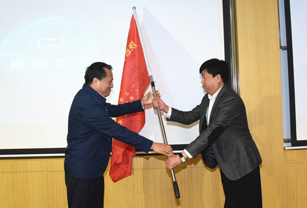 陜西省干教辦副主任郭文超向?qū)W員代表授旗