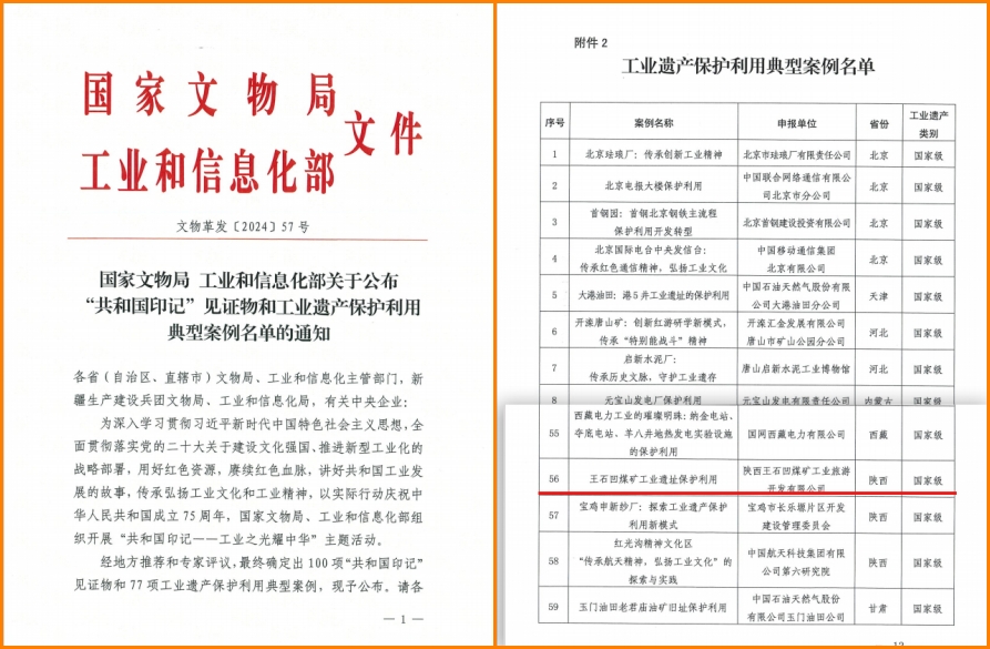 近日,國家文物局、工業(yè)和信息化部公布“共和國印記”見證物和工業(yè)遺產(chǎn)保護(hù)利用典型案例名單,確定了100項“共和國印記”見證物和77項工業(yè)遺產(chǎn)保護(hù)利用典型案例。其中,公司王石凹煤礦工業(yè)遺址保護(hù)利用入選典型案例。