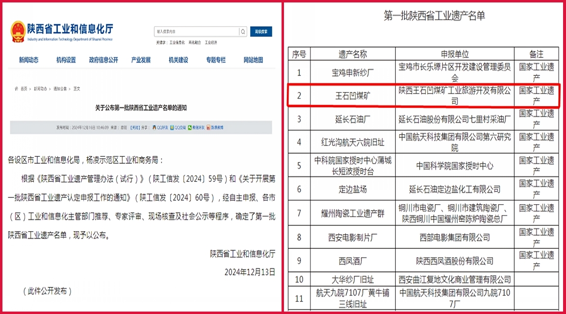 近日,陜西省工業(yè)和信息化廳公布了第一批陜西省工業(yè)遺產名單,公司王石凹煤礦憑借其獨特的歷史價值、社會價值和獨特的工業(yè)景觀入圍名單。