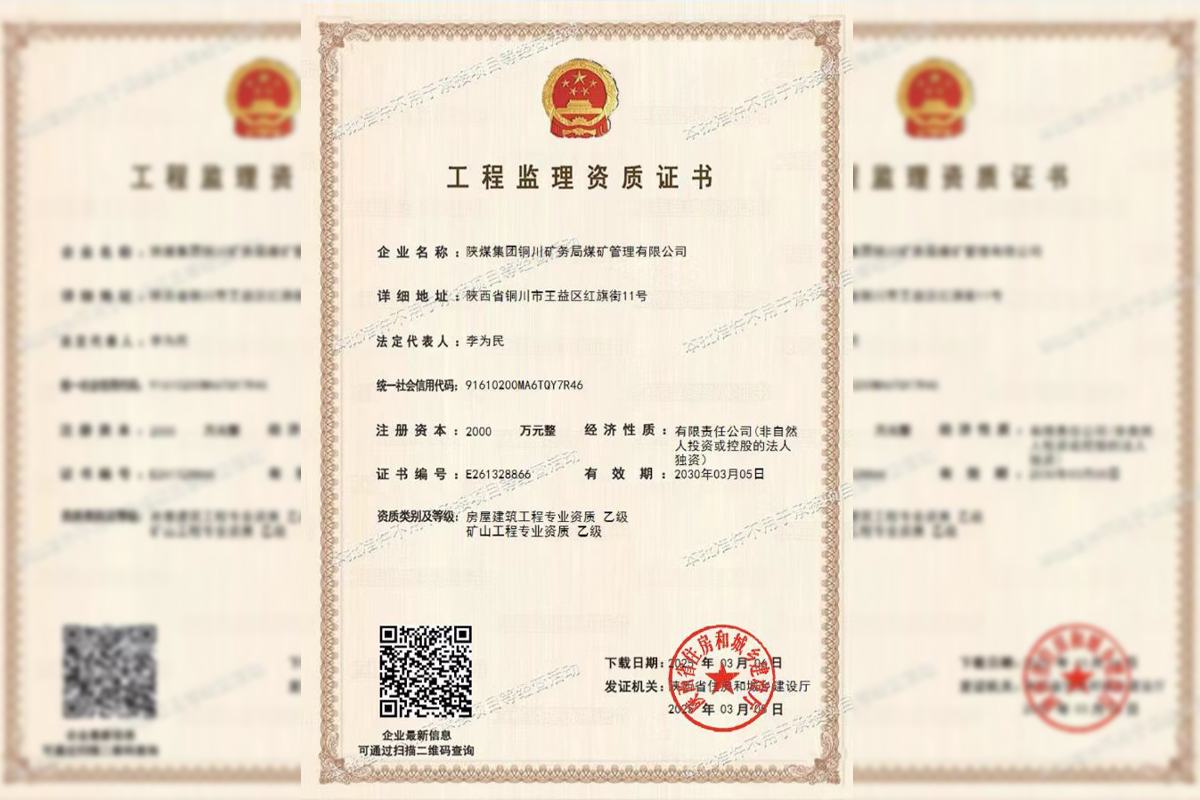 近日,煤礦管理公司經(jīng)陜西省住房和城鄉(xiāng)建設(shè)廳審查核準(zhǔn),順利獲得獲得房屋建筑工程和礦山工程監(jiān)理資質(zhì)(乙級(jí)),這標(biāo)志著該公司在業(yè)務(wù)拓展和工程監(jiān)理領(lǐng)域邁出堅(jiān)實(shí)一步,具備在相關(guān)工程領(lǐng)域提供監(jiān)理服務(wù)的能力。