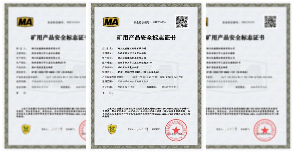 近日,銅川欣盛煤機(jī)制造有限公司順利通過安標(biāo)國家礦用產(chǎn)品安全標(biāo)志中心監(jiān)督評(píng)審,獲得了“煤礦用涂層復(fù)合鋼管礦用產(chǎn)品安全標(biāo)志證書”,為提升企業(yè)市場(chǎng)競(jìng)爭(zhēng)力再添砝碼。