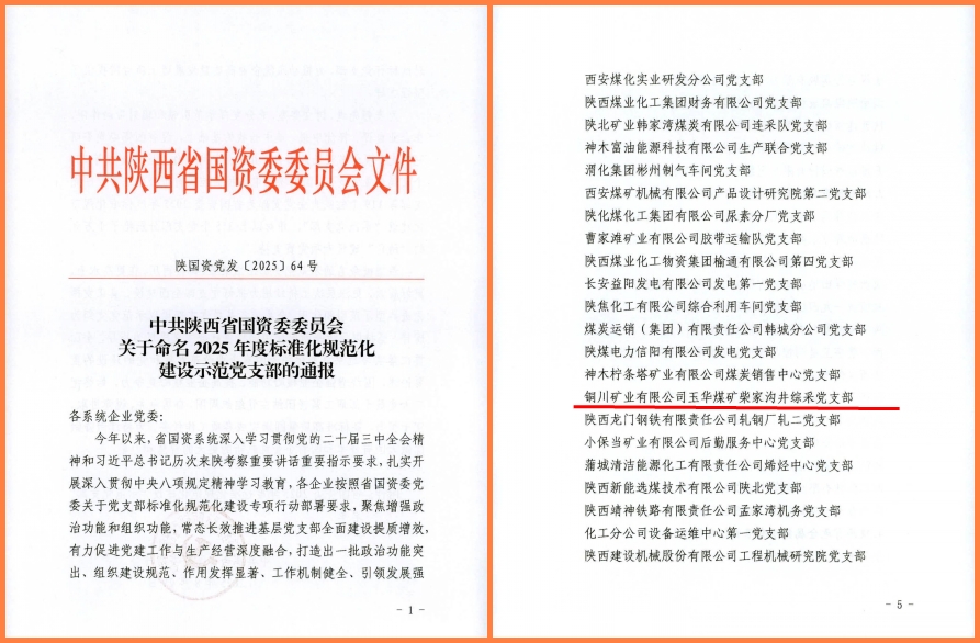 近日,陜西省國資委黨委印發(fā)了《關于命名2025年度標準化規(guī)范化建設示范黨支部的通報》,公司柴家溝井綜采隊黨支部被評為標準化規(guī)范化示范黨支部。
