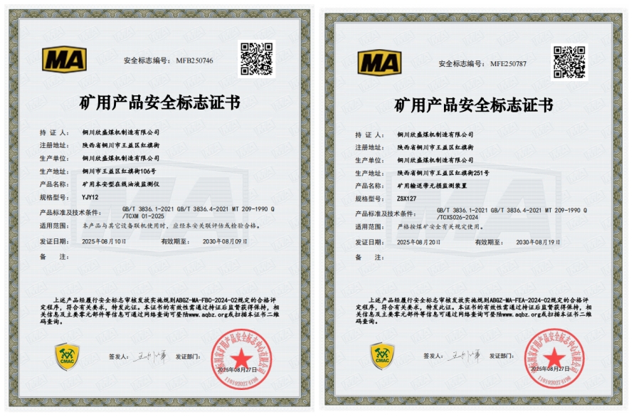 近日,銅川欣盛煤機(jī)制造有限公司成功通過了安標(biāo)國(guó)家礦用產(chǎn)品安全標(biāo)志中心評(píng)審,獲得“礦用本安型在線油液監(jiān)測(cè)安全標(biāo)志證書”和“礦用輸送帶無損監(jiān)測(cè)裝置安全標(biāo)志證書”。不僅展示了企業(yè)在煤礦安全監(jiān)測(cè)與智能化建設(shè)領(lǐng)域的技術(shù)升級(jí),更為公司進(jìn)一步拓展市場(chǎng)謀劃了新機(jī)遇。