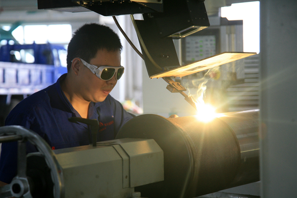 在激光熔覆生產(chǎn)車間,記者們對(duì)激光熔覆新技術(shù)應(yīng)用產(chǎn)生濃厚興趣,詳細(xì)對(duì)工件表面清理、粗車待熔覆表面、激光熔覆、精磨拋光等工藝流程及熔覆效果、產(chǎn)品推廣等方面進(jìn)行觀摩了解。銅川欣盛煤機(jī)公司負(fù)責(zé)人在現(xiàn)場(chǎng)接受媒體采訪時(shí),對(duì)激光熔覆新技術(shù)應(yīng)用和設(shè)備效率、維修效果等方面向采訪團(tuán)進(jìn)行了詳細(xì)介紹,表示,此項(xiàng)經(jīng)過市場(chǎng)調(diào)研,先期投資1700萬元建成的激光熔覆生產(chǎn)線,在液壓支架中缸及活柱維修領(lǐng)域成效發(fā)揮顯著,不僅使設(shè)備修舊勝新,使用壽命延長3倍至5倍,更替代了傳統(tǒng)電鍍生產(chǎn)鍍鉻技術(shù)結(jié)合強(qiáng)度低、易腐蝕和脫落,以及生產(chǎn)過程中引起的嚴(yán)重環(huán)境污染問題,既低碳環(huán)保又零排放,還為企業(yè)創(chuàng)新發(fā)展,滿足客戶高端化定制需求,提供了廣闊市場(chǎng)。