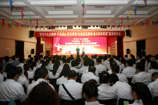 公司黨委副書記、工會(huì)主席劉啟科在會(huì)上致辭時(shí),首先對宣講團(tuán)一行的到來表示熱烈的歡迎和衷心的感謝,并簡要介紹了在陜煤集團(tuán)堅(jiān)強(qiáng)領(lǐng)導(dǎo)下銅川礦業(yè)公司改革發(fā)展工作取得的成績。他指出,本次宣講既是一次深入學(xué)習(xí)貫徹領(lǐng)會(huì)黨的十九大精神、進(jìn)一步弘揚(yáng)延安精神的專題宣講會(huì),更是一次激勵(lì)黨員干部不忘初心、牢記使命、追趕超越、奮進(jìn)前行的黨性教育會(huì),并要求公司黨員干部要通過聆聽宣講,進(jìn)一步以習(xí)近平新時(shí)代中國特色社會(huì)主義思想為指導(dǎo),以黨的十九大精神為引領(lǐng),自覺站在服務(wù)陜西追趕超越大局、服務(wù)陜煤集團(tuán)改革發(fā)展、服務(wù)銅川礦業(yè)轉(zhuǎn)型升級的高度,通過從黨的十九大精神中激發(fā)奮進(jìn)力量,從延安精神中汲取智慧營養(yǎng),努力為推動(dòng)陜煤集團(tuán)深化改革、轉(zhuǎn)型升級、追趕超越、高質(zhì)量發(fā)展,為開創(chuàng)銅川礦業(yè)建設(shè)富裕文明和諧美麗礦區(qū)的工作新局面作出新的更大的貢獻(xiàn)。