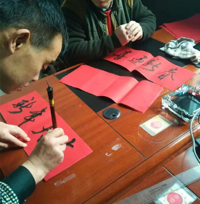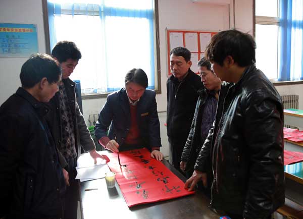 春節(jié)前夕,金華山礦書法愛好者在礦辦公大院內(nèi)義務(wù)為職工家屬寫春聯(lián)。書法愛好者們揮毫潑墨,筆走龍蛇,一副副春聯(lián),在為職工群眾送上新年祝福的同時,也寓意著來年會更加美好。