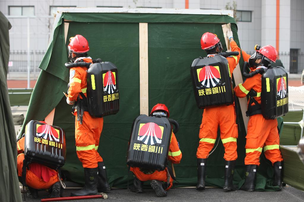 10月15日,位于銅川新區(qū)的國家區(qū)域礦山應(yīng)急救援銅川基地,秋陽高照,彩旗飄飄,在《咱們工人有力量》、《我們走在大路上》等雄壯激昂的樂曲聲中,來自全國31支礦山救援隊伍的279名參賽指戰(zhàn)員,陸續(xù)走進第十屆全國礦山救援技術(shù)競賽開幕式會場。