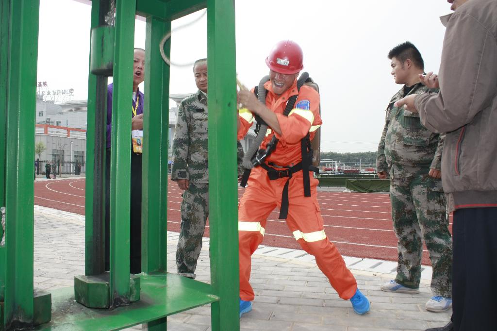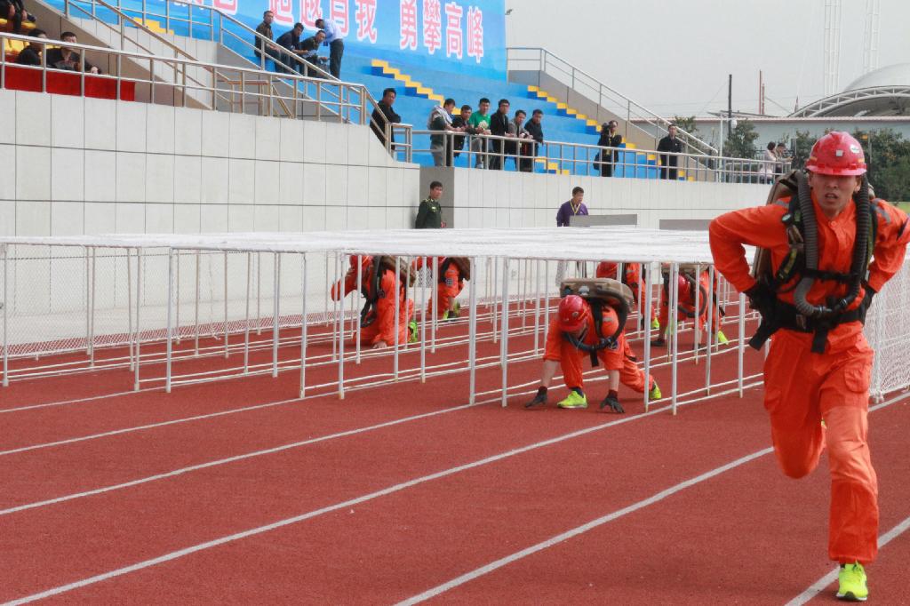 競賽綜合體能項目在救援基地室外訓(xùn)練場展開。參賽隊員6人一組,按照高空爬繩,背呼吸器千米奔跑,途中穿越兩架長15米的獨木橋,爬一條20米長的低巷,最后至終點再按規(guī)定每人拉重20公斤的檢力器50下的競賽流程展開了綜合體能競技。褐紅色的橢圓跑道上,選手身背呼吸器,攀繩越橋,鉆巷拉力,奮勇爭先,奔跑如飛,劃出了一道道力與美的弧線。