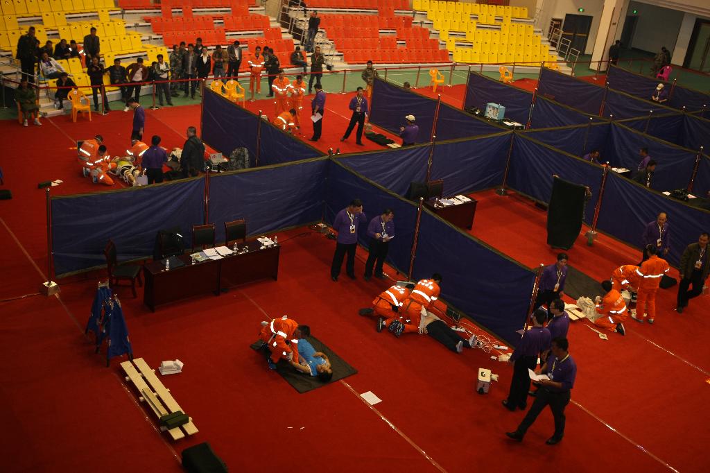 10月16日,參賽代表隊進行了模擬救災(zāi)項目的競賽。隨著救援車輛警笛的鳴響,參賽的救護隊員迅速上車,在指揮車的引導(dǎo)下,救護車輛呼嘯而去,依次進入比賽場地。