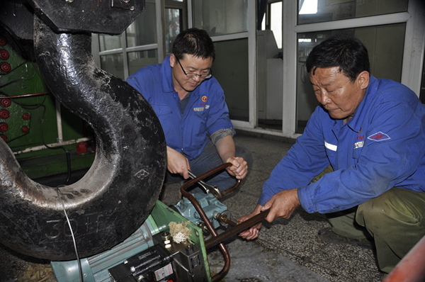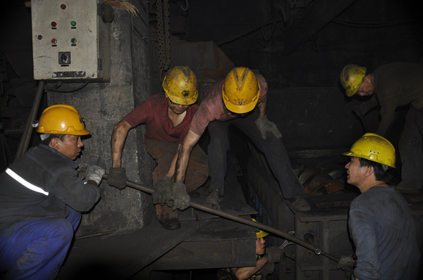 7月30日早11點,室外32°C高溫,選運區(qū)負責(zé)施工的57#機頭更換電動翻版現(xiàn)場處于較密閉空間,3名忙于搭起吊架的職工汗如雨下,青工楊超峰放下導(dǎo)鏈,又將重達幾十斤的鐵翻版挪到跟前,一口氣喝下礦黨政領(lǐng)導(dǎo)送來的降溫茶,“你看樓下滿滿當(dāng)當(dāng)?shù)能囘M場拉煤,催著要按時完成任務(wù)呢,運轉(zhuǎn)起來就是效益,咱干起來就特有勁”。說完,這名大學(xué)生青工用他早已被汗水油污浸透的衣衫抹了一把臉,加入到他的伙伴中干的熱火朝天。