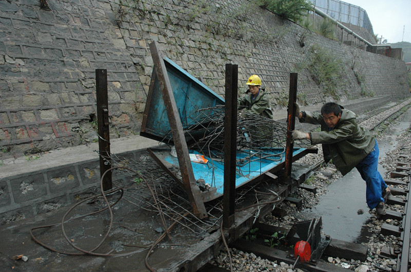 下午14時,50多車矸石雜物翻卸完畢。三人又拿起了工具,檢修機頭維護道線。