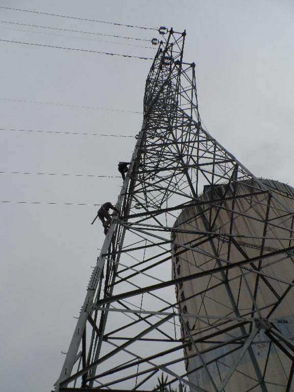 11時15分,供用電公司搶修人員到達(dá)故障現(xiàn)場, 面對全礦業(yè)公司最高、最大的46米鐵塔電纜故障,搶修人員做好安全措施登塔檢查,發(fā)現(xiàn)電纜灼燒嚴(yán)重,必須落地處理。由于故障點(diǎn)的A相電纜位于鐵塔最頂端,長達(dá)60多米,截面積400mm2的銅芯高壓電纜分量極重,而且安裝電纜時為保證安全,加裝了許多特殊的固定包箍,給拆除降落工作帶來了極大的困難。高空電纜拆除降落過程中既要保證作業(yè)人員安全,又不能損傷電纜, 根據(jù)現(xiàn)場情況,該分公司領(lǐng)導(dǎo)和搶修人員一起制定了安全合理的電纜拆除落地方案。夏季的烈日高懸中天,搶修人員帶好保險帶等安全防護(hù)裝備開始向塔頂攀爬,從塔底向上望去,陽光下的他們身影漸漸變小,他們的形象卻越發(fā)高大。在搶修人員一刻不停歇的努力下,兩個多小時后,故障電纜終于安全落地。