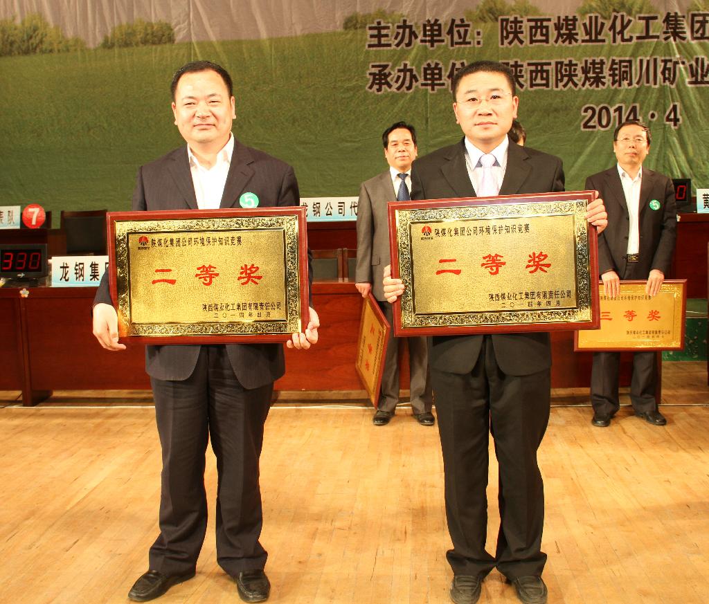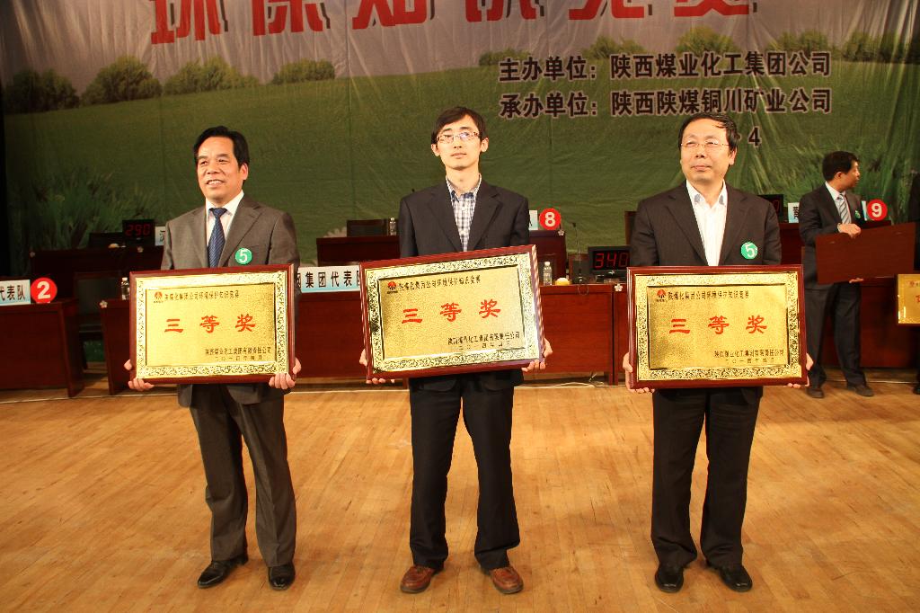 競賽名次決出后,集團公司副總工程師田玉民、集團公司安全生產(chǎn)環(huán)保部副經(jīng)理孫斌建為獲得競賽優(yōu)秀獎的代表隊頒獎;省環(huán)保廳固廢中心主任宋東剛為獲得競賽第三名的代表隊頒獎;銅川礦業(yè)公司黨委書記王蓬為獲得競賽第二名的代表隊頒獎;集團公司安全生產(chǎn)環(huán)保部經(jīng)理趙文革為獲得競賽第一名的銅川礦業(yè)公司代表隊頒獎。