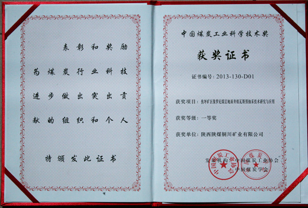 中國煤炭工業(yè)協(xié)會、中國煤炭學會組織來自煤炭行業(yè)企事業(yè)單位、科研院所、大專院校的專家120余人對2013年度地質測量、礦井建設、煤炭開采、采掘機械、機電與控制、煤礦安全、煤炭加工利用、管理科學與軟科學、醫(yī)學九個專業(yè)組的435個項目認真進行了評審,完成了一等、二等、三等獎項目的評選,銅川礦業(yè)公司與中煤科工集團西安研究院聯(lián)合開展的《焦坪礦區(qū)侏羅紀煤層地面井組瓦斯預抽采技術研究與應用》項目研究榮獲中國煤炭工業(yè)科學技術一等獎,研究成果達到國際先進水平。這是陜西省唯一獲此殊榮的科研項目。