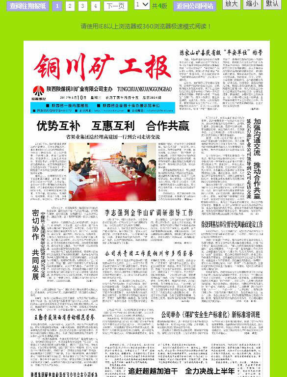為了做好銅川礦工報(bào)電子版的開(kāi)發(fā)設(shè)計(jì),公司新聞中心多次開(kāi)會(huì)研究,層層下達(dá)任務(wù),要求人人獻(xiàn)計(jì),個(gè)個(gè)出力。研發(fā)團(tuán)隊(duì)充分調(diào)用各方面資源,通過(guò)大量學(xué)習(xí),查閱資料,請(qǐng)教業(yè)內(nèi)同行專(zhuān)家,借鑒人民日?qǐng)?bào)、環(huán)球時(shí)報(bào)、銅川日?qǐng)?bào)等數(shù)字報(bào)刊的制作方式和閱覽效果,通過(guò)反復(fù)研究,制定方案,在節(jié)約資金的前提下論證其可行性,最后決定自己編寫(xiě)制作,通過(guò)熬夜鉆研,反復(fù)實(shí)驗(yàn),不斷嘗試,檢驗(yàn)效果,終于取得成功?,F(xiàn)在,只要打開(kāi)銅川礦業(yè)公司網(wǎng)站,就能即時(shí)瀏覽銅川礦工報(bào)電子報(bào)。電子報(bào)基本功能完備齊全,瀏覽操作簡(jiǎn)單易行,在視覺(jué)體驗(yàn)上,界面簡(jiǎn)潔大方, 背景采用護(hù)眼綠色。電子報(bào)不僅可以在手機(jī)上打開(kāi)閱讀,方便年輕讀者閱讀習(xí)慣,而且增設(shè)了微信、微博、QQ空間等平臺(tái)的分享功能,有利于正向能量的對(duì)外傳播。