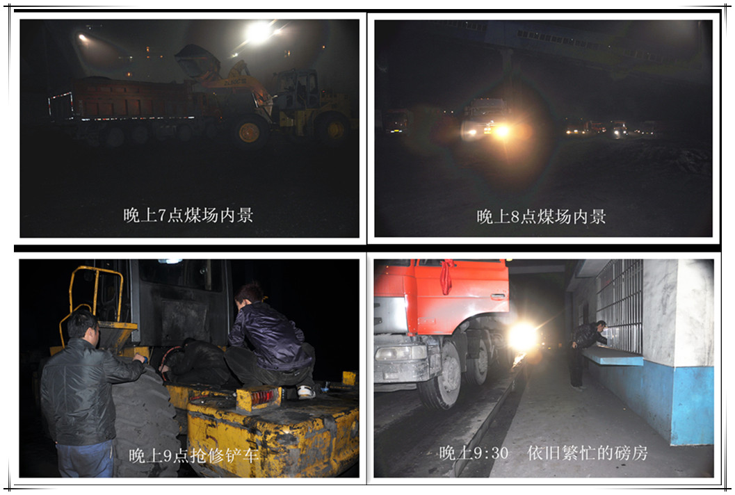 2月24日下午6點,玉華礦選運區(qū)鏟車司機李剛狼吞虎咽的匆匆吃完飯后,換下了另一名顧不上吃飯的鏟車司機。“一天裝多少車我也記不清,拉煤車太多了,四輛鏟車5個司機,人歇車不歇,換著吃飯”?!暗浇裉烀刻炱骄b400車以上,10000多噸”,旁邊銷售部維護車輛進場秩序的工作人員接道。下午7點,天色漸黑,煤場內(nèi)打開照明燈,與車燈交相輝映,煤場內(nèi)瞬間燈火通明?!拔覀兊穆毠つ艹钥?,就像昨天,從早上7:30一直裝車到晚上12:00以后,任勞任怨毫無怨言”。鏟車修理工小柴說道“累不怕,多裝車才能多賣煤,效益好了咱才能掙錢,就讓繁忙來得更猛烈一點吧”。